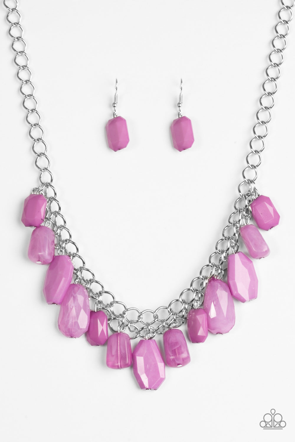 Featuring asymmetrical cuts, cloudy and polished purple beads swing from the bottom of interlocking silver chains. The faceted beads drip below the collar, adding a shimmery edge to the effervescent fringe. Features an adjustable clasp closure.